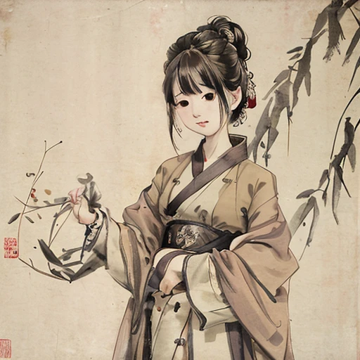 shukezouma, negative space, , shuimobysim , , portrait of a woman standing , willow branches, (masterpiece, best quality:1.2), traditional chinese ink painting, , modelshoot style, peaceful, (smile), looking at viewer, wearing long hanfu, hanfu, song, willow tree in background, wuchangshuo,